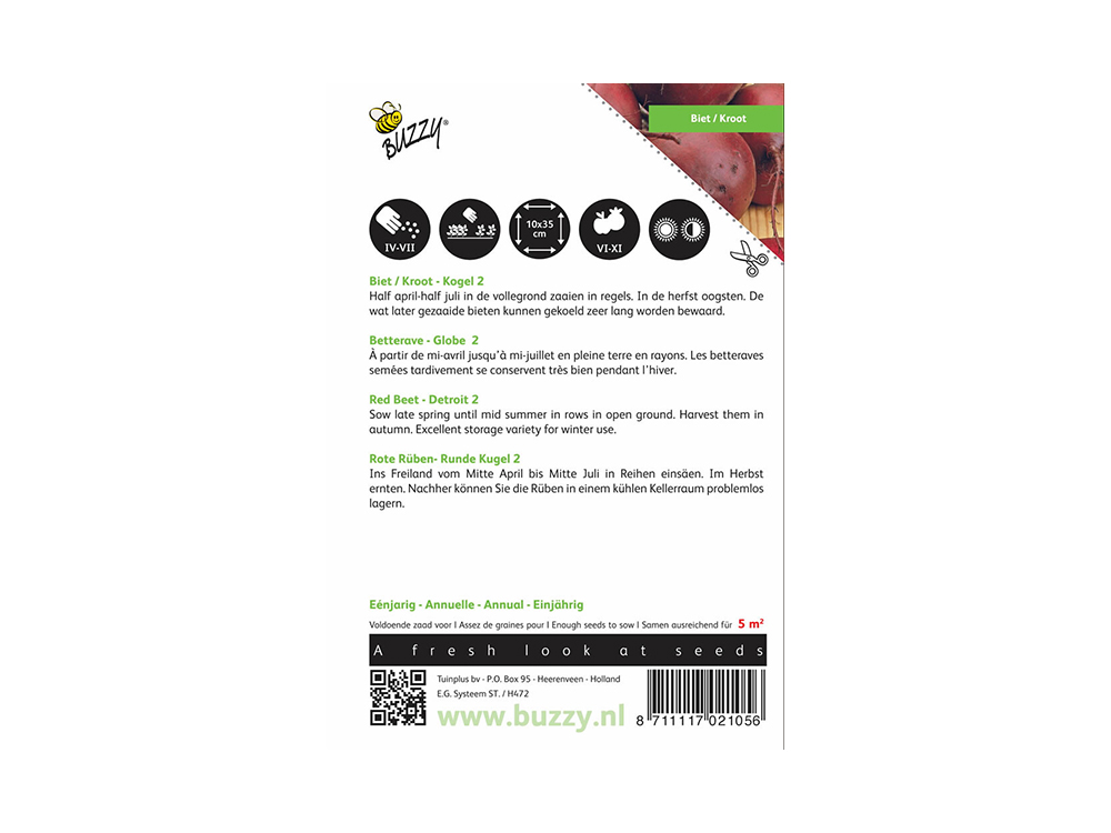 Semez les graines directement dans le sol de la mi-avril à la mi-juillet , en rangées ou rangées de 30 à 35 cm entre elles. Après 10 à 12 jours, les graines germent. Éclaircez les plantes lorsqu’elles mesurent environ 5 cm de haut, de sorte qu’elles soient espacées de 10 cm. Les plantes retirées peuvent être replantées ailleurs avec un espacement de 10 cm. Les betteraves semées plus tard peuvent être bien conservées.