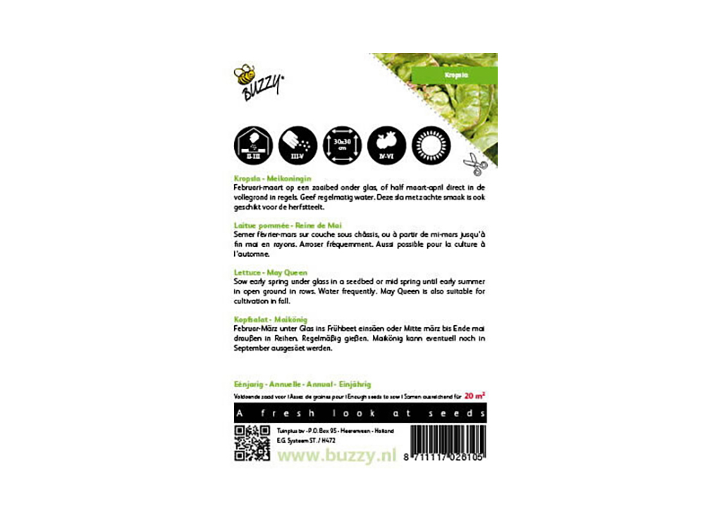La laitue de chou La reine de mai est une laitue de chou délicieuse et tendre à la couleur magnifique. La variété est particulièrement adaptée à la culture précoce en terrain ouvert. À semer de mars à avril (pas plus tard), directement en terrain découvert. Semez sur un sol humide, en rangs (ou rangs) espacés de 30 cm ou dans un lit de semences. Semez superficiellement, les graines ne devraient être qu’à peine couvertes. Après l’émergence, éclaircez généralement à 30 cm (enlevez les plantes en excès entre les deux) ou plantez à 30 x 30 cm.