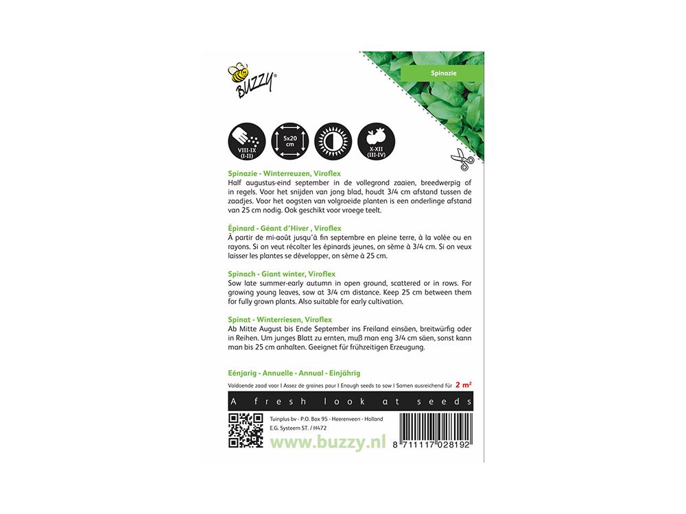 Semez les épinards géants d’hiver du début août à la mi-septembre. Semez largement sur un lit de semence ou sur des rangées espacées de 20 à 25 cm, dans un sol bien détaché. Les épinards ont besoin de beaucoup d’azote. Gardez le sol suffisamment humide. Les plantes qui ont émergé survivent à l’hiver et germent rapidement au début du printemps. À récolter entre mars et avril. Cela dépend bien sûr beaucoup de la météo. Adapté au congélation.
