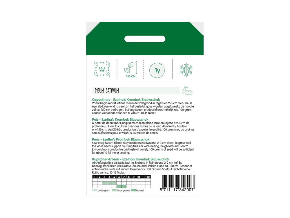 Les plantes, également appelées raasdonders, atteignent une hauteur de 1,5 à 2 mètres. Après la gracieuse floraison violace-rosée, de nombreuses gousses de couleur violette se développent. Les graines ont un goût délicieux, à la fois fraîches et sèches.