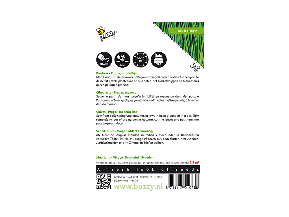 La ciboulette (Allium schoenoprasum) est une plante vivace probablement originaire de Sibérie et d’Asie de l’Est, et qui est devenue connue aux Pays-Bas via l’Italie. Elle pousse bien dans tous types de sols et possède un goût fin et délicat. Les tiges de la ciboulette sont longues, étroites et herbeuses, et de magnifiques fleurs violet-bleu apparaissent la deuxième année, c’est pourquoi elles sont souvent utilisées aussi comme plantes bordantes.