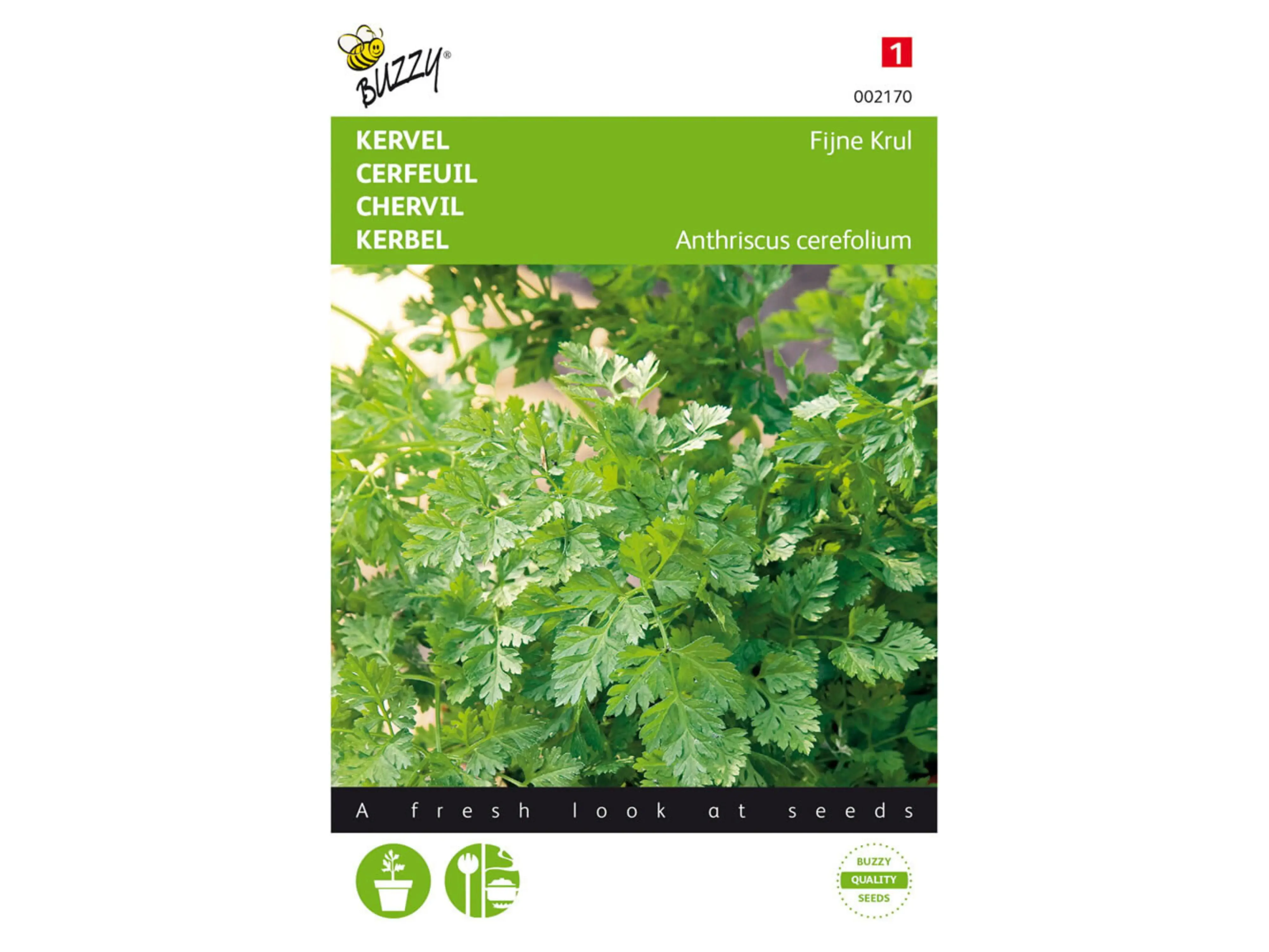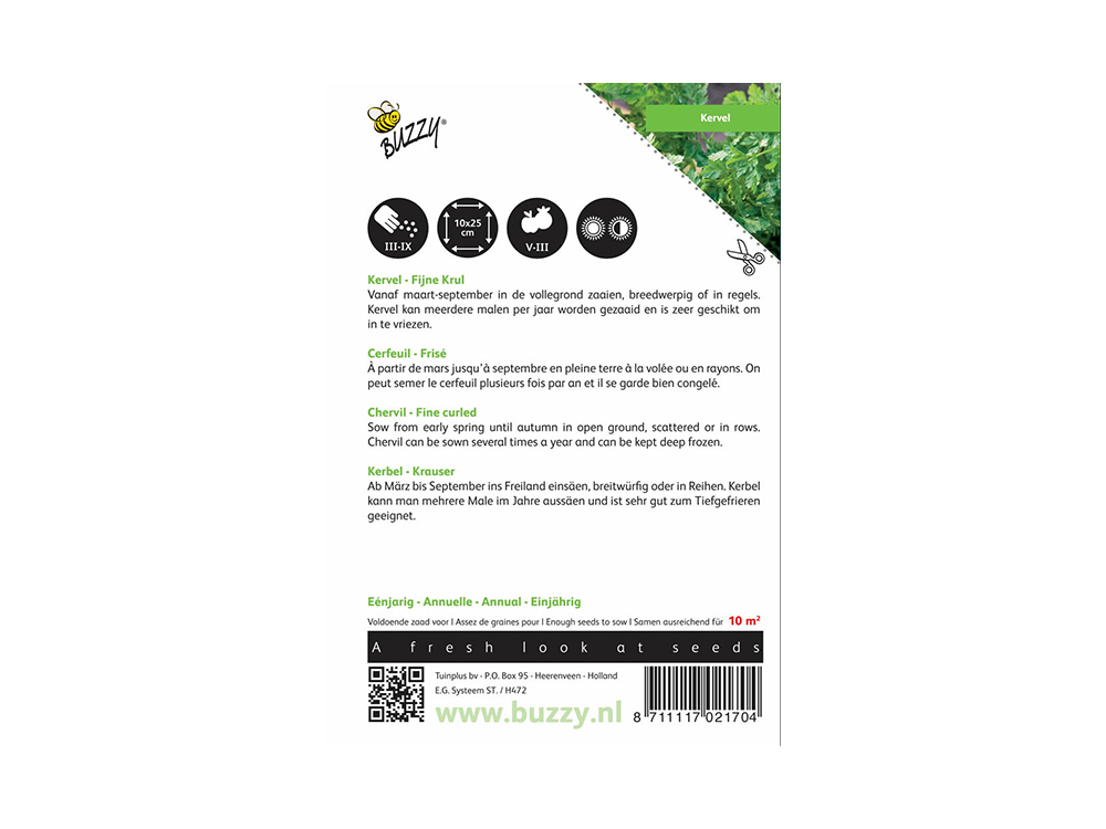 Le chévil (Anthriscus cerefolium) est une herbe délicieuse que l’on peut récolter régulièrement, après quoi elle repousse rapidement. La feuille fine est parfaite dans les soupes, les œufs, la viande et le fromage, et est délicieuse avec le concombre et les pois. La plante atteint une hauteur de 40 à 60 cm.