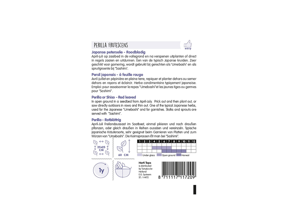 Le persil japonais à feuilles rouges est une variété annuelle de persil à feuilles rouges qui peut atteindre jusqu’à 60 cm de haut. Une herbe japonaise typique utilisée comme garniture pour des plats tels que l'« Umeboshi » et comme légume de pousse pour le « Sashimi ».