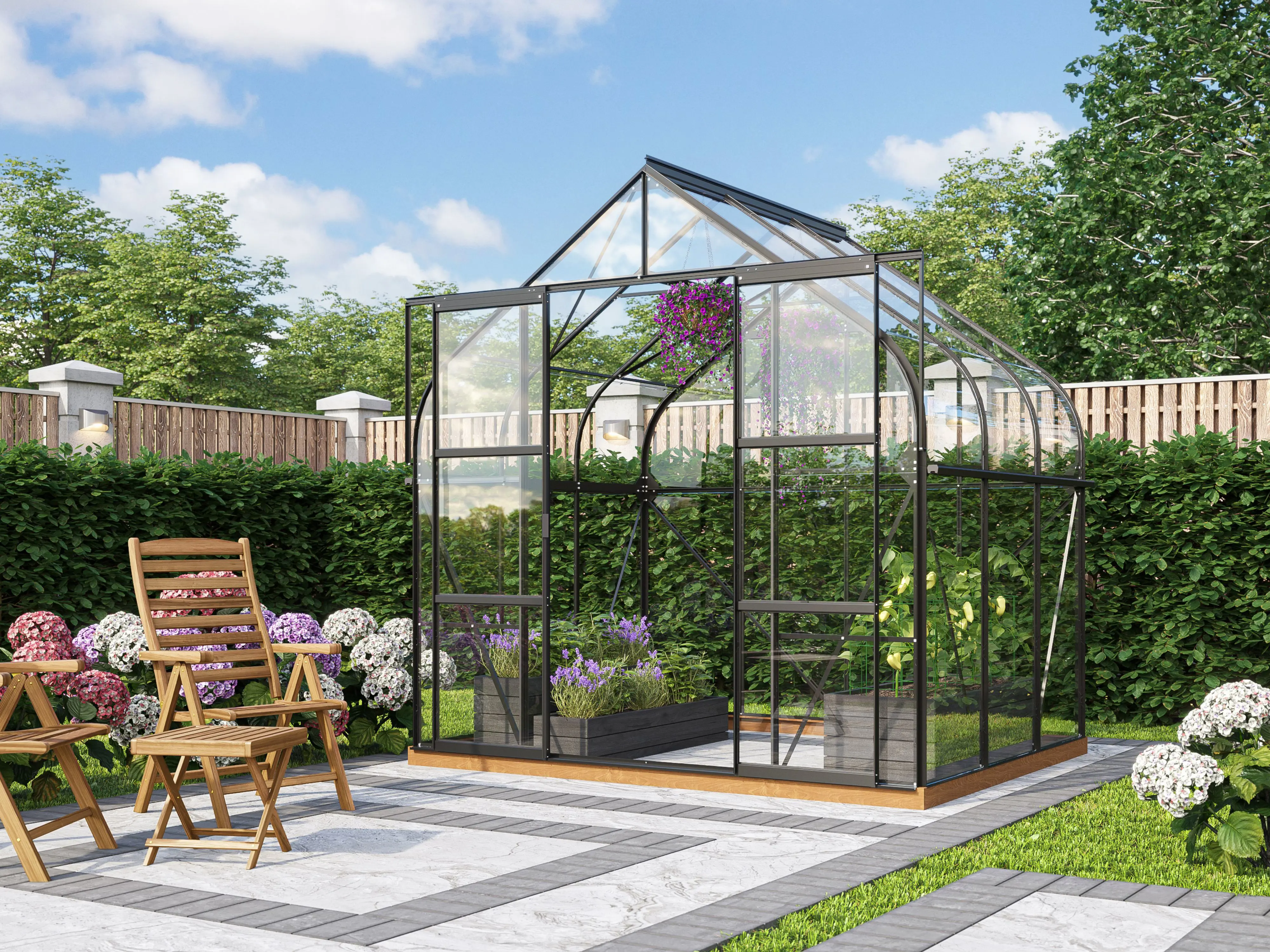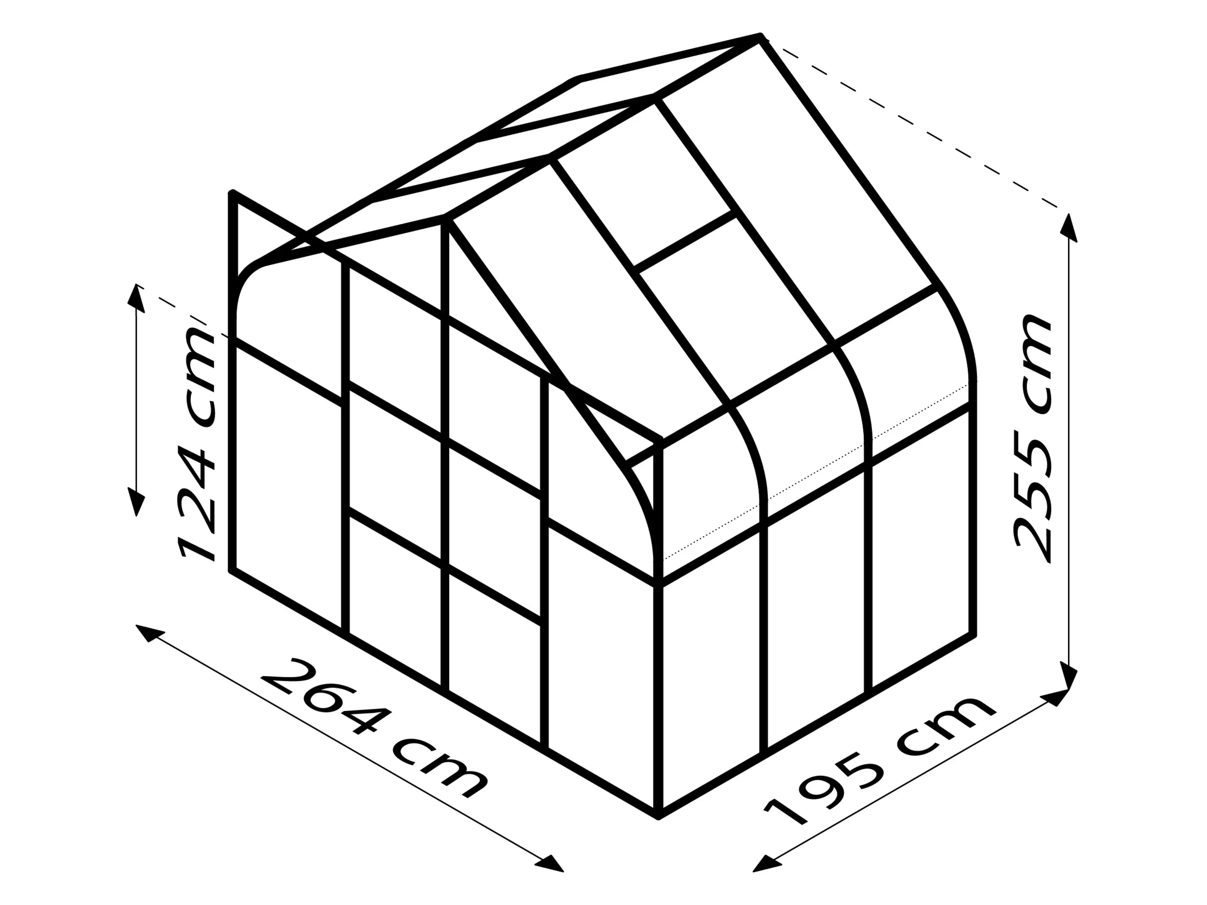 La serre est fabriquée en aluminium robuste, noir, recouvert de poudre , et équipée de série d’un verre de sécurité de 3 mm, garantissant une construction robuste et un maximum de lumière. Les bords courbés sont recouverts de feuilles de polycarbonate transparent résistantes aux UV. Parmi les bonus pratiques figurent des gouttières intégrées et 2 à 4 puits de lumière (selon la taille). Celles-ci offrent une excellente ventilation et un climat optimal pour la culture.