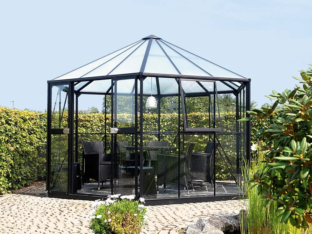 Avec la serre Hera, Vitavia a créé une serre au design ludique, idéale aussi comme salle de jardin ou tonnelle. Avec une hauteur de gouttière de 188 cm, la Hera offre une hauteur de tête suffisante partout.