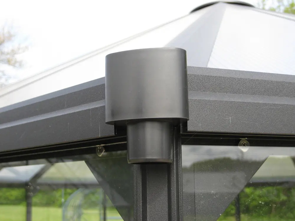 Les murs sont équipés de verre de sécurité transparent de 3 mm d’épaisseur, offrant une vue dégagée sur le jardin. Ce vitrage est solidement fixé par des bandes plastiques noires durables qui courent sur toute la longueur des fenêtres. Le toit est équipé de plaques de polycarbonate à double paroi stabilisées UV (HKP) de 6 mm d’épaisseur, qui protègent les plantes des rayons UV nocifs et assurent une incidence optimale de la lumière.