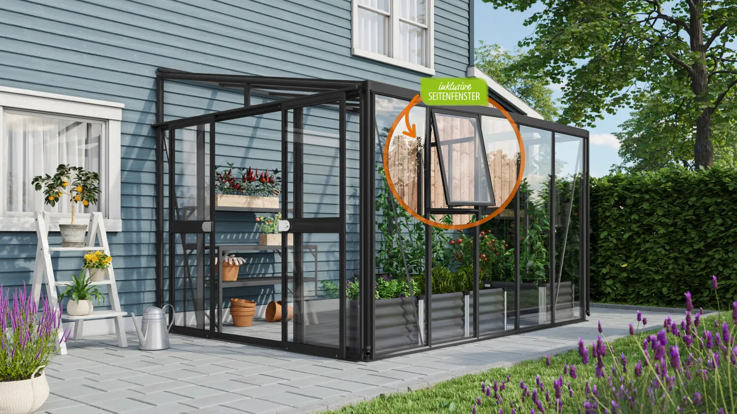 Les parois latérales sont faites de verre de sécurité (ESG) cristallin de 3 mm d’épaisseur , tandis que le toit est équipé de plaques de polycarbonate à double paroi de 10 mm d’épaisseur. Celles-ci protègent les plantes des rayons du soleil éclatant, maintiennent une température stable et résistent aux branches qui tombent.