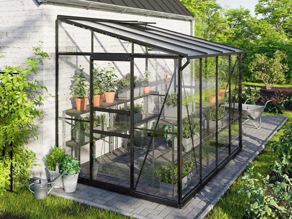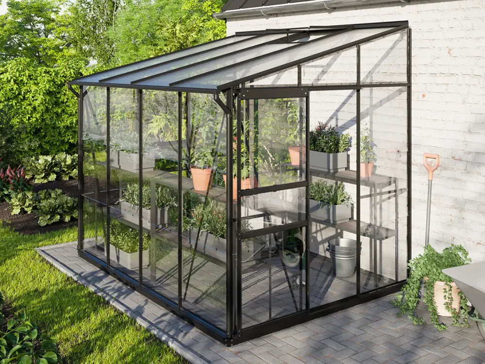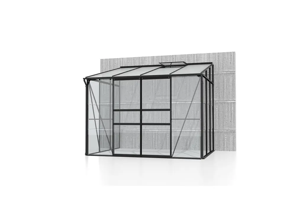 La haute faîte et la porte simple ou double coulissante facilitent l’accès à la serre, tandis qu’une ou deux puits de lumière (selon la taille) assurent un espace bien ventilé. Les profils robustes en aluminium noir revêtu en poudre restent beaux et faciles à entretenir pendant des années. Le cadre robuste est également équipé de verre de sécurité de 3 mm