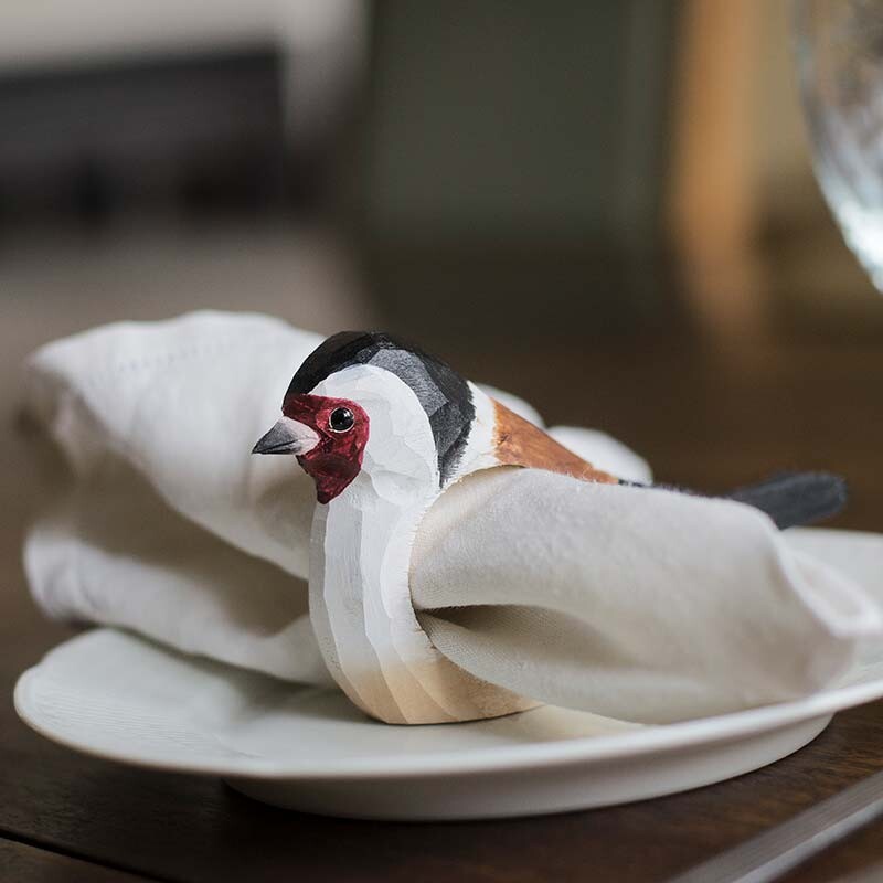 Le chardonneret est un oiseau aux couleurs vives et à l’apparence exotique avec son bec clair, sa tête rouge sang, ses plumes d’ailes jaunes, ses joues blanches et son « couvre-chef » noir. C’est donc une fête pour tous les amateurs d’oiseaux avec ces anneaux sur la table à manger !