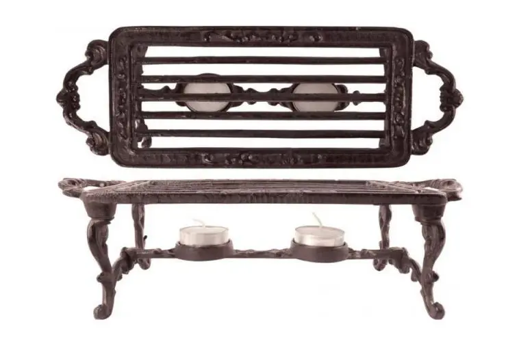 Avec ce rechaud de style victorien unique de style Esschert , vous ne serez plus dérangé par des plats froids pendant le dîner. Ce chauffe-plat intemporel, avec support pour deux bougies à plat, garde les plats et théières ignifuges merveilleusement chauds.