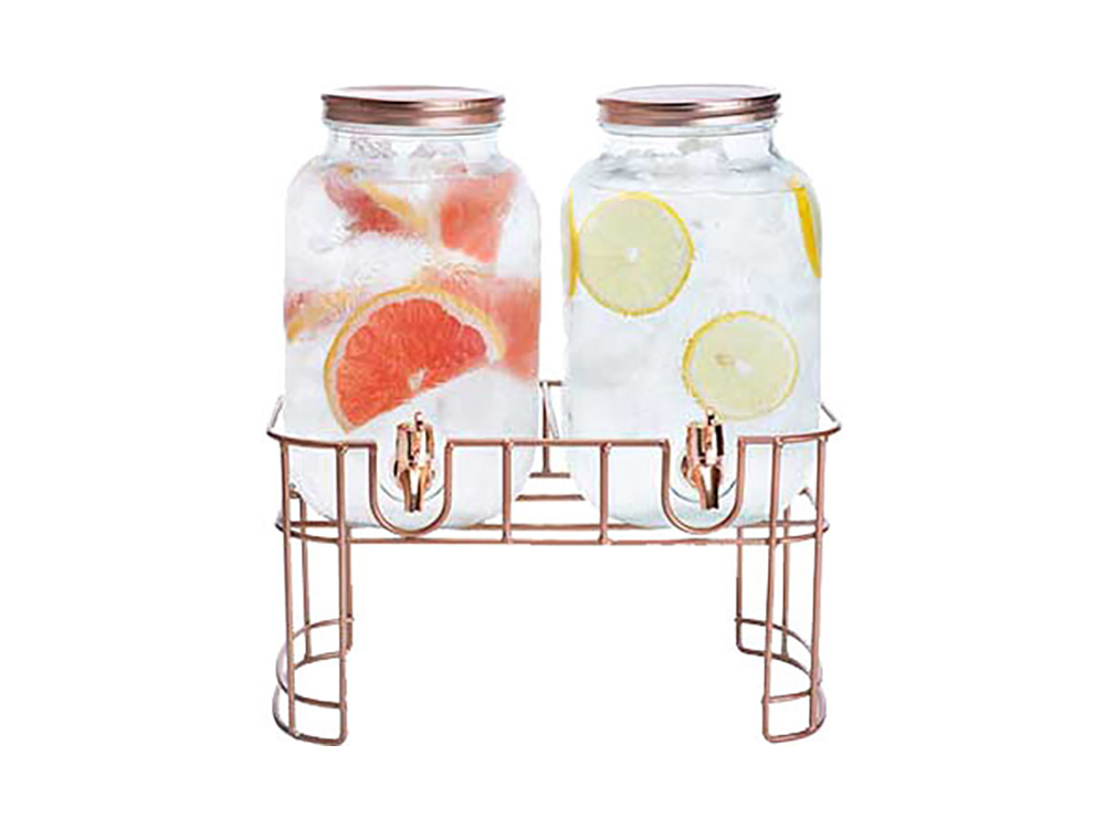 Dans les deux distributeurs, vous pouvez proposer différentes boissons : jus de fruits, boissons gazeuses, vin, eau au citron, thé glacé ou sangria. Les deux distributeurs ont une capacité de 3 litres et sont recouverts d’un couvercle et d’un robinet en or rose. Grâce à la base surélevée , les distributeurs tiennent fermement sur la table et les verres peuvent être facilement remplis à nouveau.