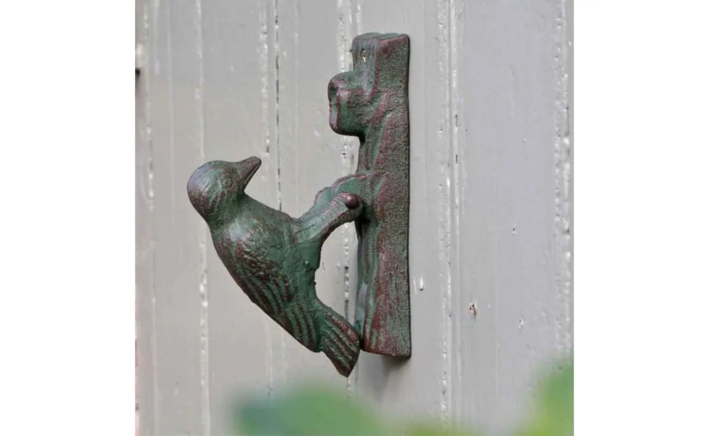 Le heurtoir de porte est de couleur vert cuivre et, avec son design classique et robuste, il s’intègre parfaitement à n’importe quel jardin de campagne.