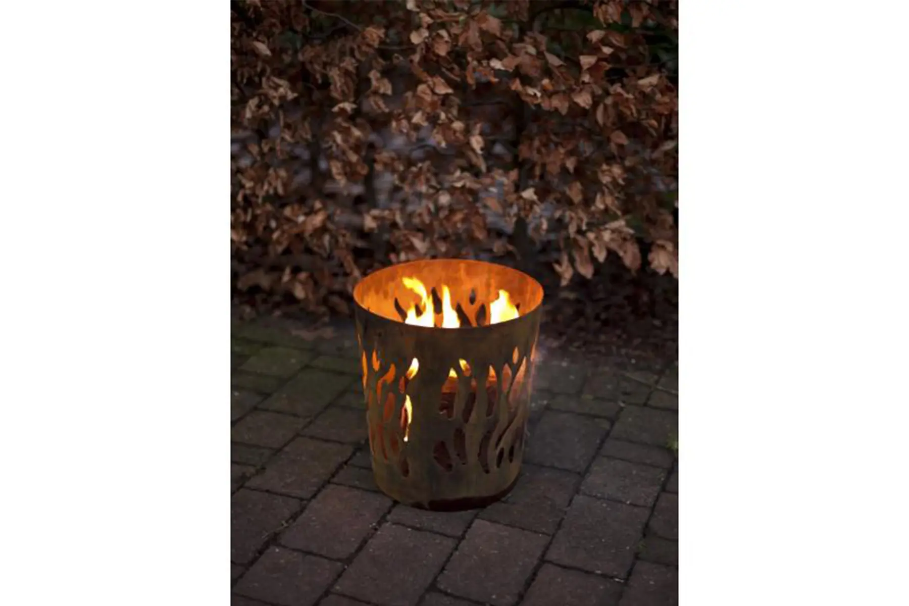 Un charmant foyer de conception Esschert, parfait pour allumer en toute sécurité des torches suédoises. Le panier est en acier déjà rouillé et le mur est percé d’un motif de flamme, ce qui rend l’ensemble très décoratif lorsqu’une torche brûle dans le seau.