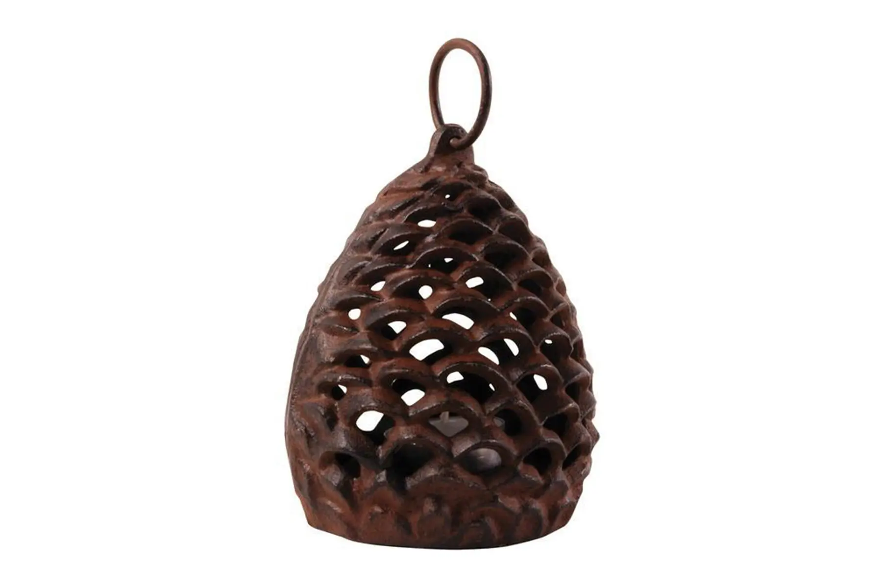 Créez une ambiance enchanteresse sur votre terrasse, votre table de jardin ou chez vous avec cette magnifique lanterne brune ancienne. Le porte-tambourines en fonte, conçu comme une pomme de pin, fait danser la lumière des bougies d’une manière unique.