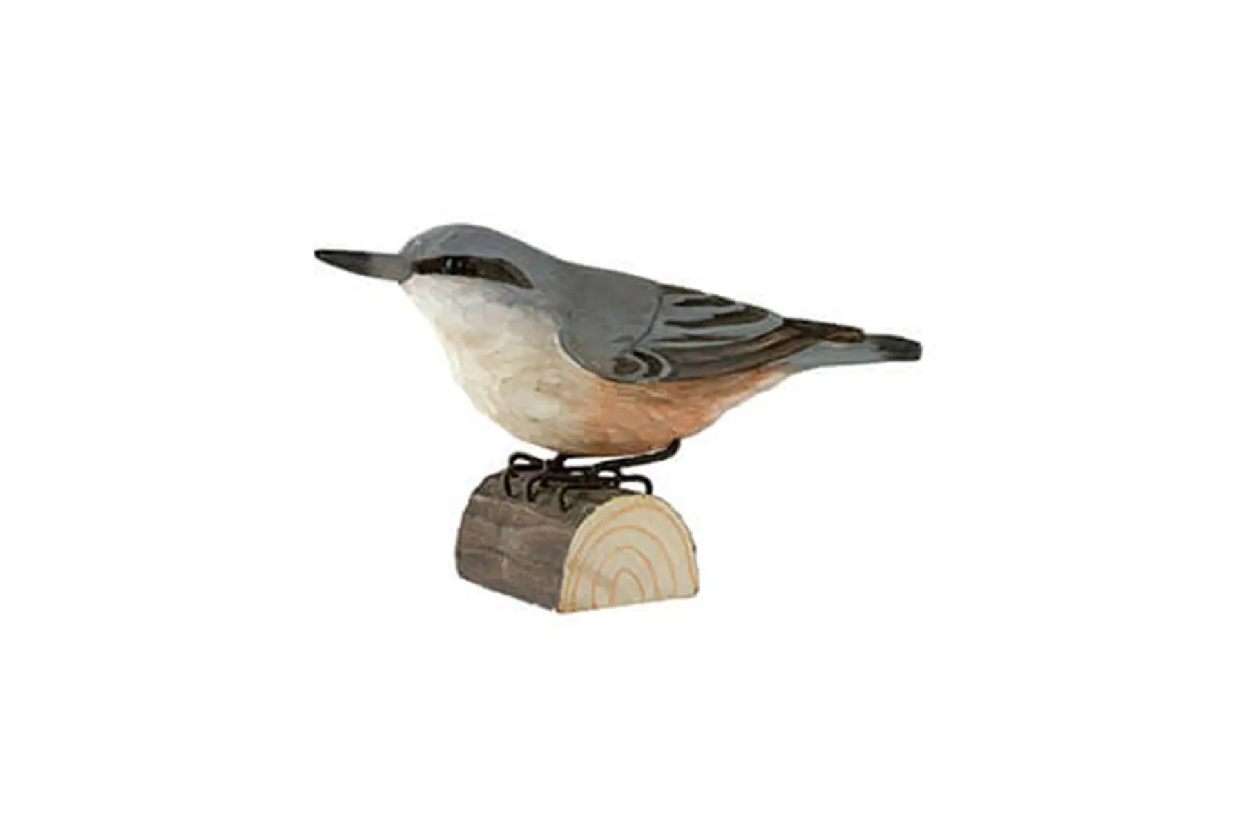Sittelle en bois artisanale (Sitta europaea). La sittelle est exposée grandeur nature et peinte avec une peinture écologique
