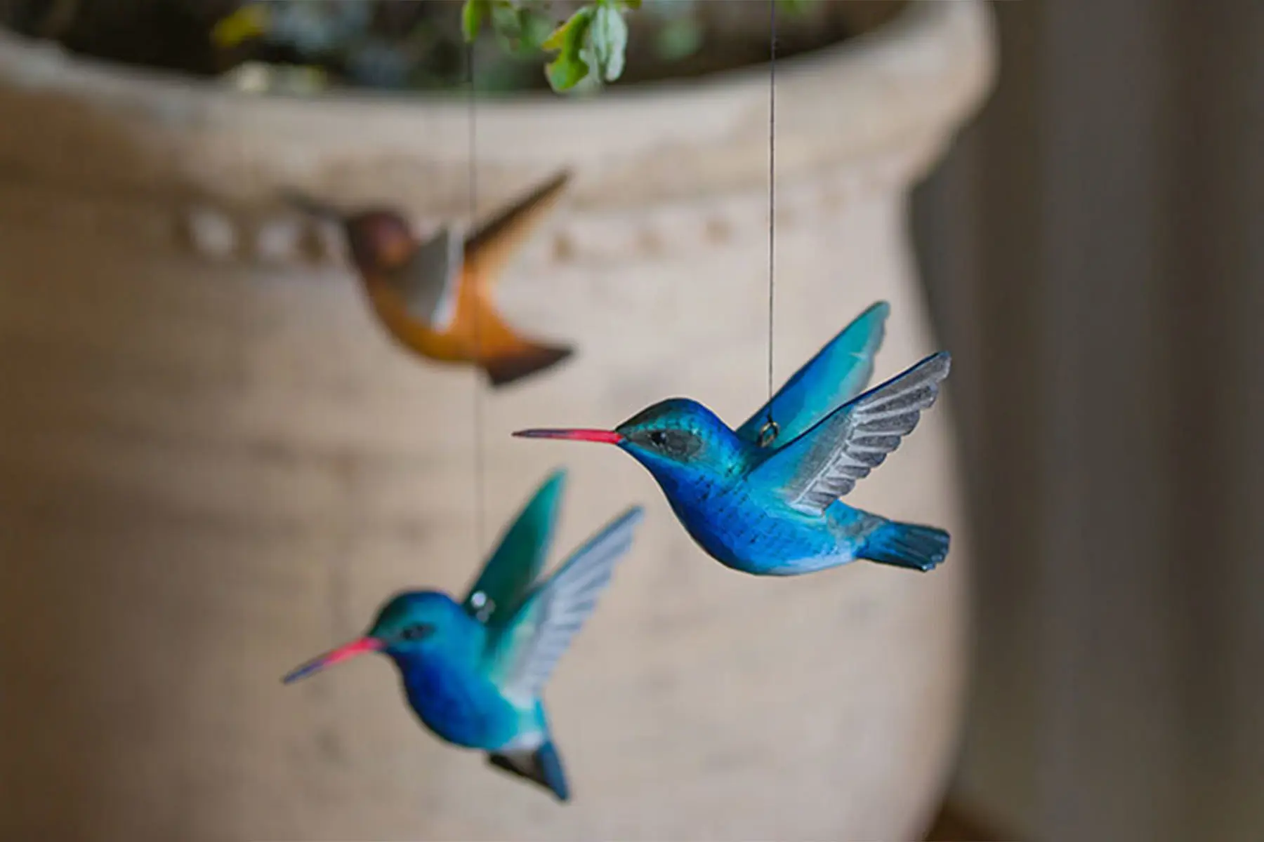 Les colibris authentiques taillés dans le bois apportent la beauté de la nature à votre maison. Ces deux colibris réalistes sont faits main et chacun a une attitude typique de cet oiseau. Leur plumage coloré est peint avec une peinture respectueuse de l’environnement. Avec le crochet fourni, ils peuvent facilement être suspendus à l’intérieur.