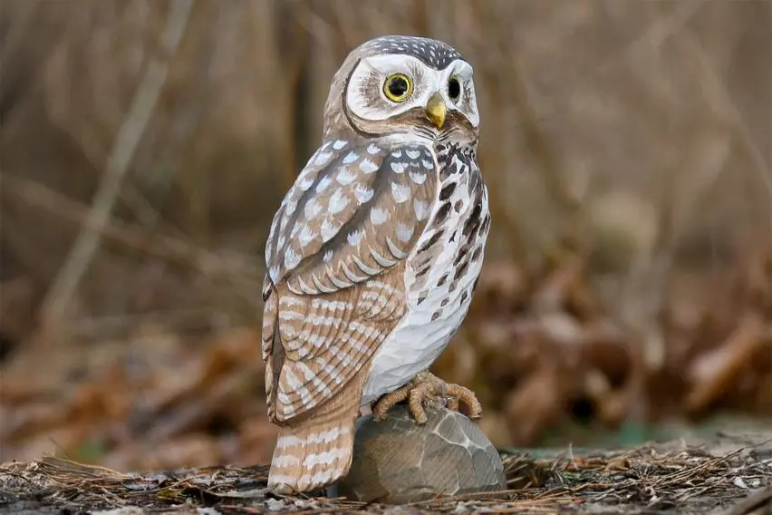Petit hibou en bois au design traditionnel. La petite chouette est représentée grandeur nature et peinte avec une peinture écologique.