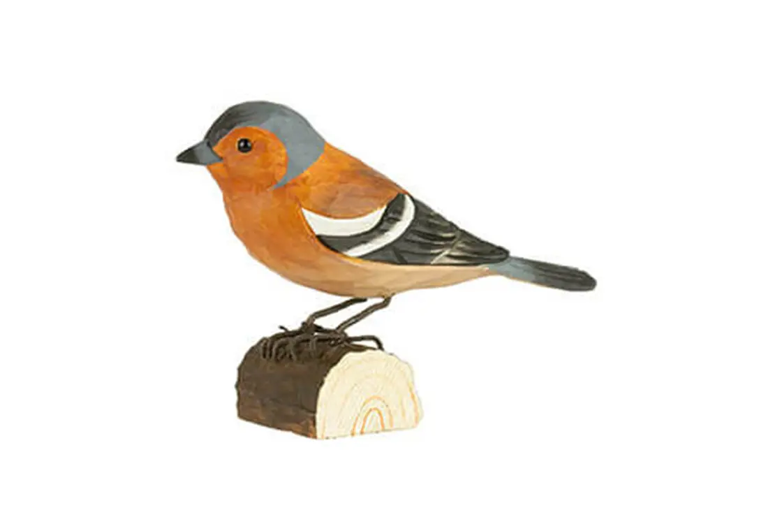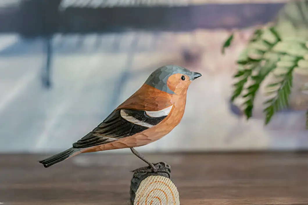 Un diamant en bois artisanal. Le pinson est exposé grandeur nature et peint avec une peinture écologique.