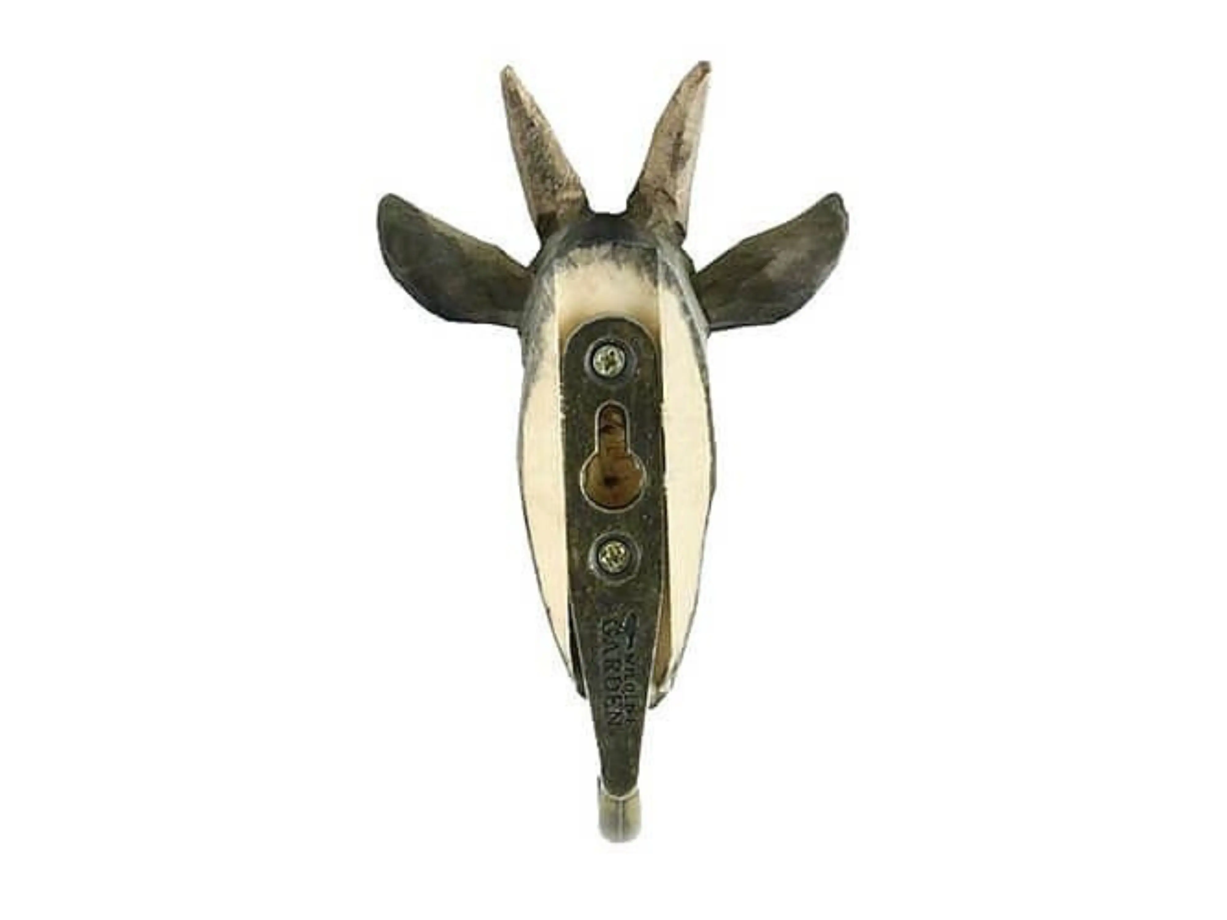 En bas de la tête se trouve un crochet en métal couleur bronze avec lequel on peut fixer des torchons de cuisine, des peignoirs, des bijoux, des clés, entre autres,.... .