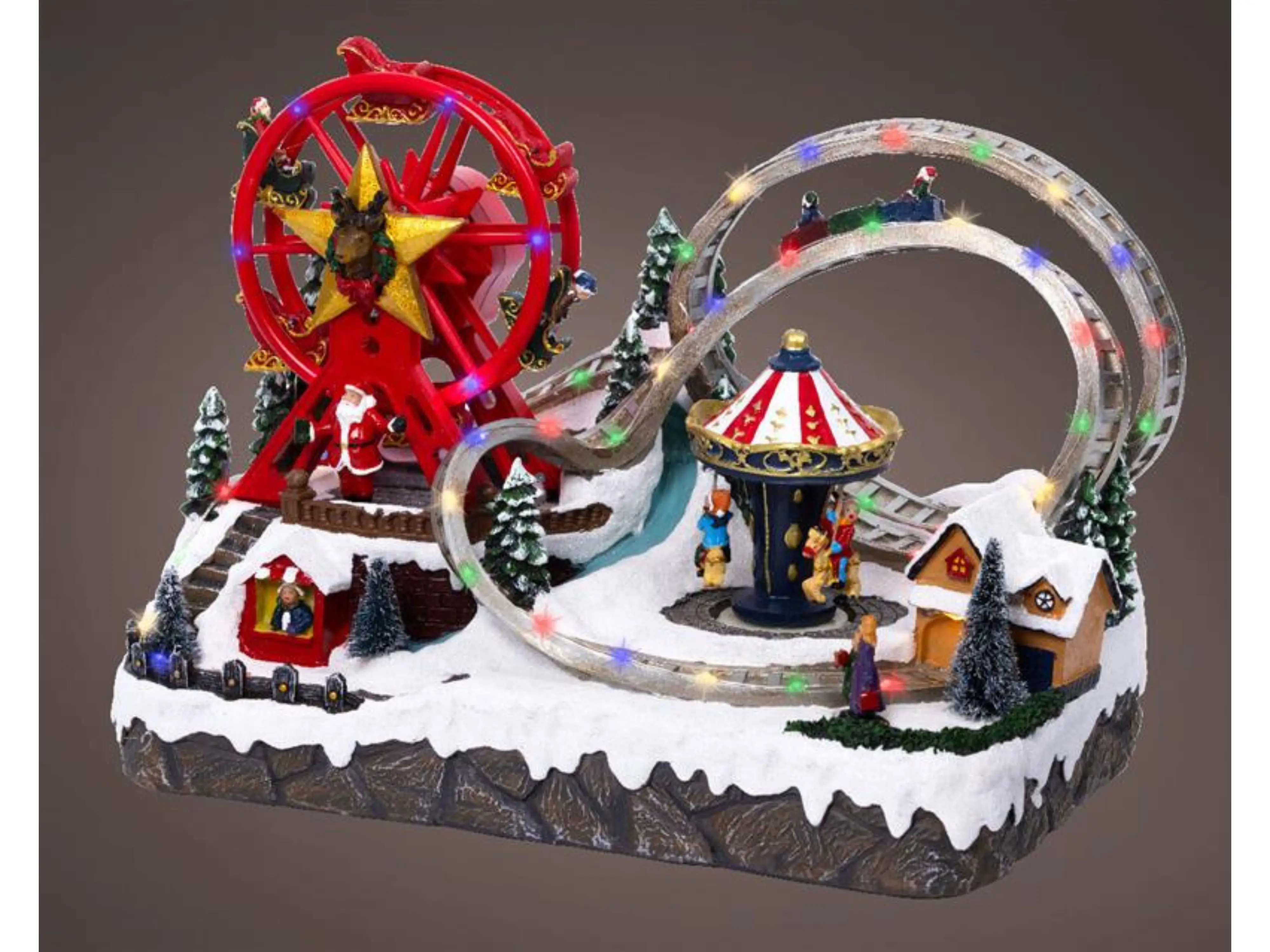 Cette scène de Noël donne vie à l’atmosphère d’un festival hivernal chaleureux , accompagnée d’une foire joyeuse. Imaginez des attractions colorées, des manèges, des stands et des éclairages festifs, le tout enveloppé dans un paysage hivernal. La combinaison de mouvement, de musique et de lumières clignotantes crée une ambiance animée et festive qui séduit les jeunes comme les moins jeunes. La scène évoque les souvenirs des festivals d’hiver et des foires nostalgiques, où les familles se réunissent pour profiter de la magie des fêtes.